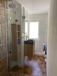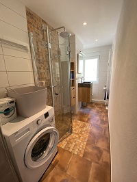 Das Badezimmer ist modern und elegant gestaltet, mit einer geräumigen Dusche und allen notwendigen Annehmlichkeiten, wie Waschmaschine und Wäscheständer.